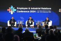 Direktur SDM Pertamina sekaligus sekaligus Ketua Bidang 4 Employee & Industrial Relations FHCI M. Erry Sugiharto saat mejadi narasumber pada sesi talkshow Employee &…