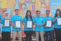 Vice President CSR Solution BCA Titi Yusnarti (kiri) menerima penghargaan yang diberikan Ketua Umum PMI Pusat Muhammad Jusuf Kalla (ketiga kanan), Minggu (14/7). Jakarta,…
