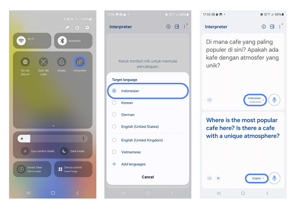 Dengan melakukan 3 langkah di Galaxy S24, sekarang kamu bisa berkomunikasi dalam 16 bahasa, termasuk Bahasa Indonesia, dalam genggamanmu.