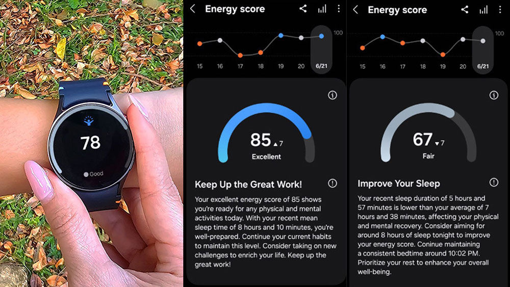 Fitur Energy Score mencerminkan tingkat energi pengguna yang dihitung berdasarkan kualitas tidur, detak jantung ketika tidur, dan aktivitas fisik yang dilakukan di hari sebelumnya. Skor numerik yang muncul dapat menjadi rekomendasi bagi pengguna untuk menentukan aktivitas fisik yang akan mereka lakukan di hari itu. Energy Score didukung dengan Galaxy AI serta teknologi canggih lain seperti generasi terbaru BioActive Sensor untuk memberikan analisis yang akurat, mulai dari heart rate tracking hingga sleep monitoring.