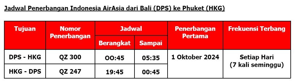 Vera juga menambahkan dengan rute baru ini, Indonesia AirAsia berharap dapat memperkuat kontribusinya dalam meningkatkan arus wisatawan internasional yang masuk ke Bali, serta memfasilitasi perjalanan masyarakat Indonesia ke luar negeri, khususnya ke Hong Kong, yang dikenal sebagai salah satu pusat keuangan dan destinasi wisata ternama di dunia.