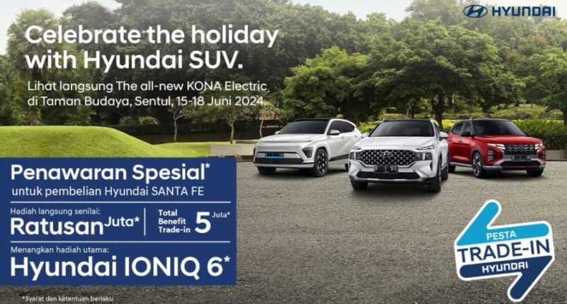 Hyundai juga menghadirkan “Pesta Trade-in Hyundai” di Taman Budaya. Bagi keluarga yang ingin untuk tukar tambah kendaraan lamanya juga bisa melakukan trade-in. Pengunjung dapat melakukan proses tukar tambah kendaraan lebih aman, nyaman dan praktis dalam satu tempat karena Hyundai telah menyediakan area One Stop Service yang dapat memudahkan pengunjung untuk memilih mobil impian keluarga. Untuk semakin memudahkan pengunjung, Hyundai juga menyediakan layanan seperti car inspection hingga penawaran program financing yang dapat memberikan konsumen pilihan yang sesuai dengan kebutuhan. Melalui program ini, pengunjung tidak hanya dapat melakukan trade-in mobil Hyundai yang dimiliki, namun terbuka juga untuk pemilik mobil merek lain.
