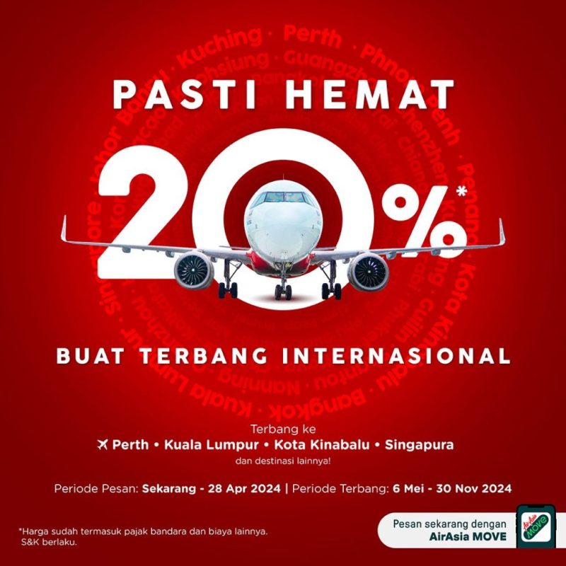 Jakarta, 22 April 2024 – Maskapai penerbangan berbiaya hemat terbaik dunia versi skytrax, Indonesia AirAsia menawarkan promo hemat 20% untuk pembelian tiket penerbangan di 28 rute internasional. Tiket pemesanan dibuka mulai 22 April -28 April 2024 dan terbang mulai dari 6 Mei – 30 November 2024. Pemesanan dapat dilakukan melalui website resmi AirAsia dan aplikasi airasia MOVE.
