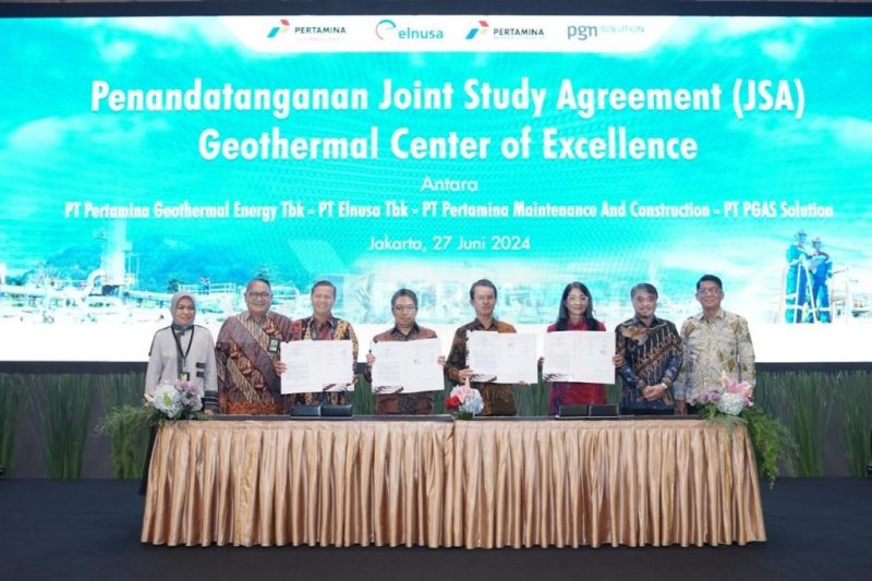 Penandatanganan JSA Geothermal Center of Excellence yang dilakukan pada Kamis, 27 Juni 2024, di Grha Pertamina, Jakarta, ini dihadiri oleh Direktur Strategi, Portofolio, dan Pengembangan Usaha PT Pertamina (Persero) A. Salyadi Saputra, Direktur Utama Pertamina New and Renewable Energy (PNRE) John Anis, Direktur Utama PGE Julfi Hadi, Direktur Keuangan Elnusa Stanley Iriawan mewakili Direktur Utama Elnusa, Direktur Utama PGASOL Sabaruddin, dan Direktur Utama PertaMC Andry Widiasti. Kehadiran secara langsung para pimpinan perusahaan yang berkolaborasi menunjukkan pentingnya JSA yang akan memfasilitasi diskusi, kajian, wadah tukar informasi, serta studi bersama untuk pengembangan energi panas bumi ini.