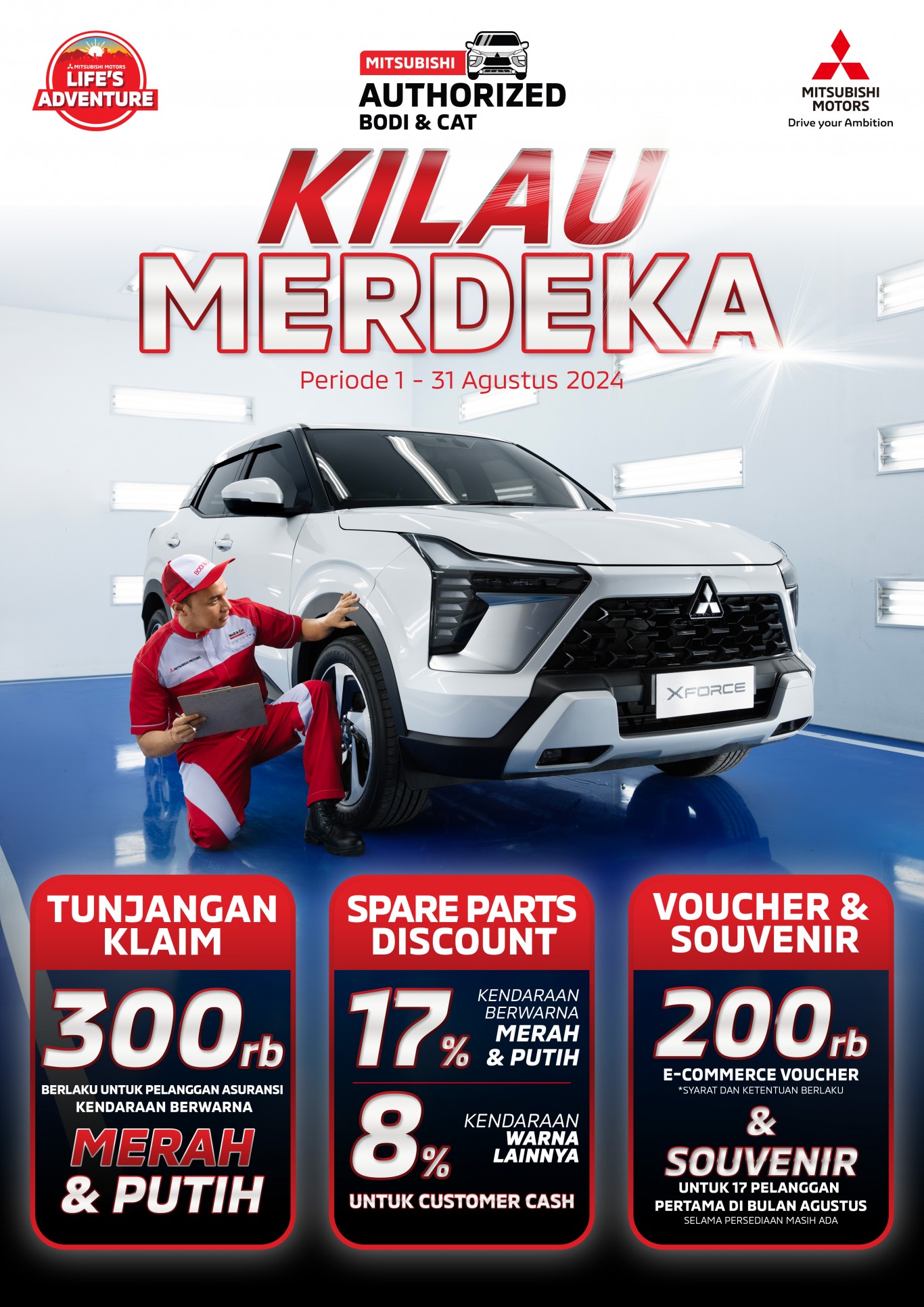Melalui “Kilau Merdeka Campaign” MMKSI menghadirkan program layanan perawatan dan perbaikan bodi kendaraan melalui fasilitas Mitsubishi Bodi & Cat yang berlangsung dari 1-31 Agustus 2024, yang terdiri dari: