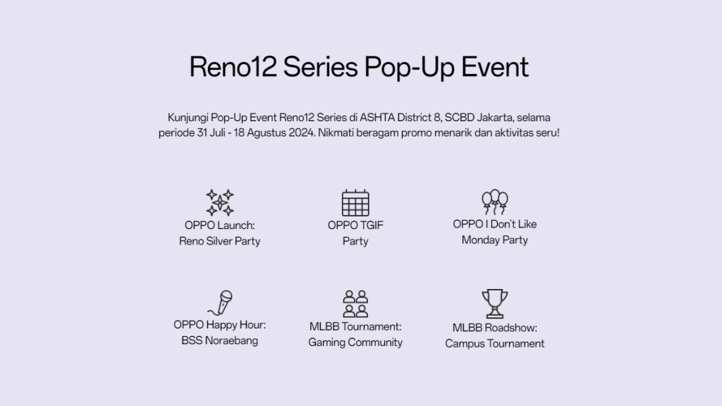 Selain mengungkapkan berbagai teknologi dan fitur terbaru pada Reno12 Series, OPPO juga akan menggelar beragam rangkaian acara menarik melalui Reno12 Series Pop-Up Event untuk menyambut kehadiran Smartphone AI Pertama OPPO di tanah air. Acara-acara tersebut antara lain adalah OPPO Launch: Reno Silver Party, OPPO TGIF Party, OPPO I Don’t Like Monday Party, OPPO Happy Hour: BSS Norebang, MLBB (Mobile Legends) Tournament: Gaming Community, dan MLBB Roadshow: Campus Tournament yang akan digelar di ASHTA District 8, SCBD Jakarta, mulai 31 Juli hingga 18 Agustus 2024.