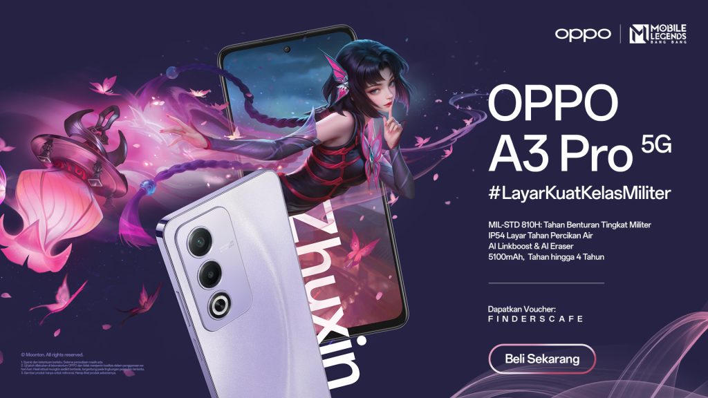 Selain itu, OPPO A3 Pro 5G juga ideal untuk memenuhi kebutuhan hiburan, termasuk bermain game. Kolaborasi OPPO A3 Pro 5G dengan Mobile Legends: Bang Bang menawarkan pengalaman bermain yang lancar dan mulus berkat performa mumpuni untuk push rank. Meski terkadang konsumen merasa kesal saat bermain dan membanting smartphone, OPPO A3 Pro 5G tetap aman dengan MIL-STD 810H Tahan Benturan Tingkat Militer, struktur internal yang diperkuat, spons peredam guncangan, serta Panda Glass yang diperkuat dua kali lipat untuk pelindung layar.