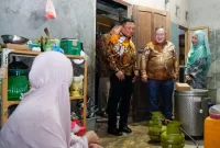 Telkom Bambang Permadi Soemantri Brodjonegoro (tengah) dan Direktur Utama Telkom Ririek Adriansyah (dua dari kanan) melihat langsung proses produksi berbagai produk dari Balla Ratea,…